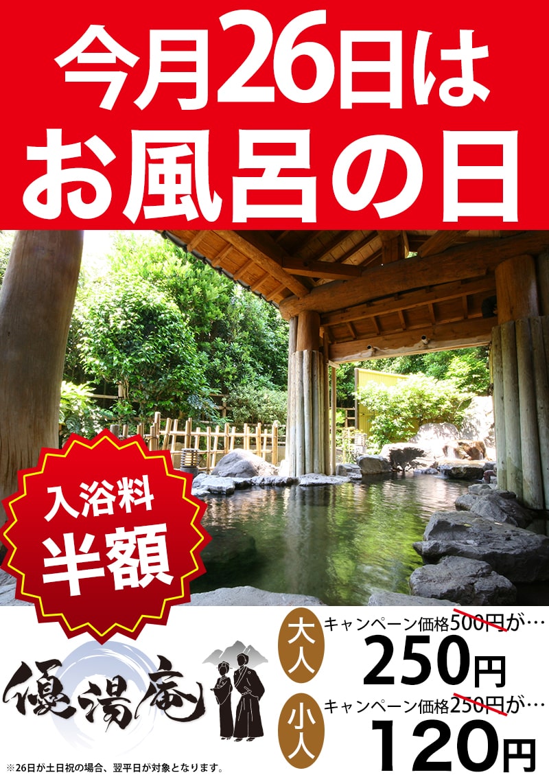 日頃の感謝の気持ちを込めて、毎月26日は「優湯庵おふろの日」となっております。
