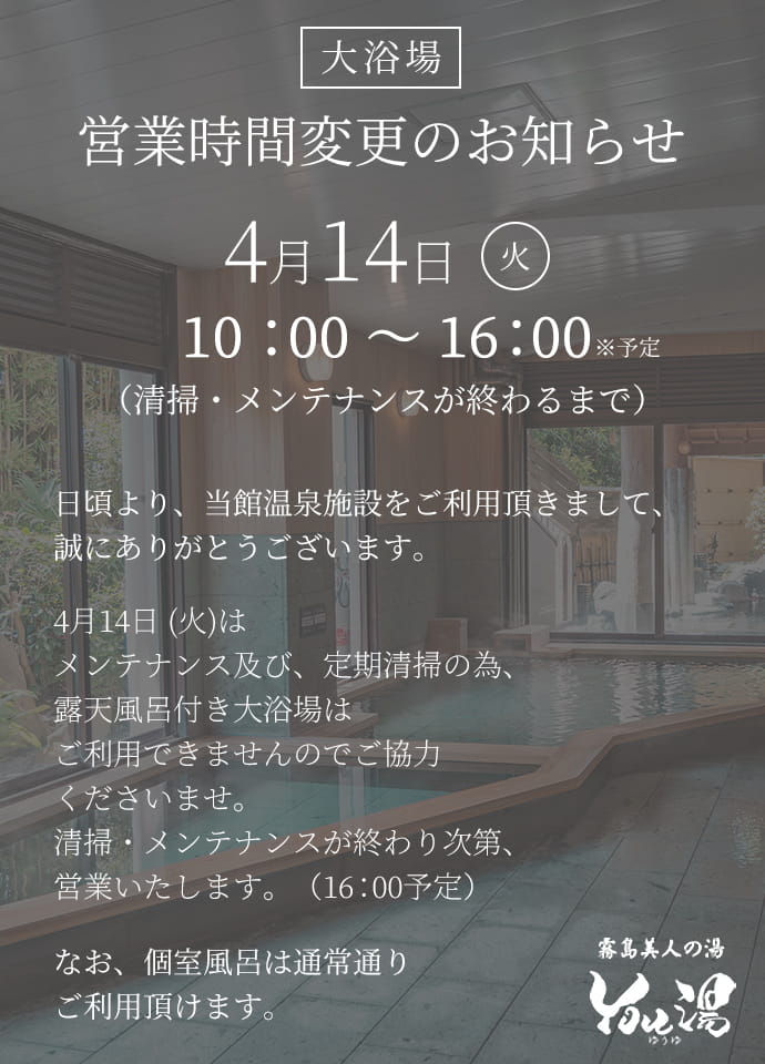 4/14 大浴場営業時間変更のお知らせ
