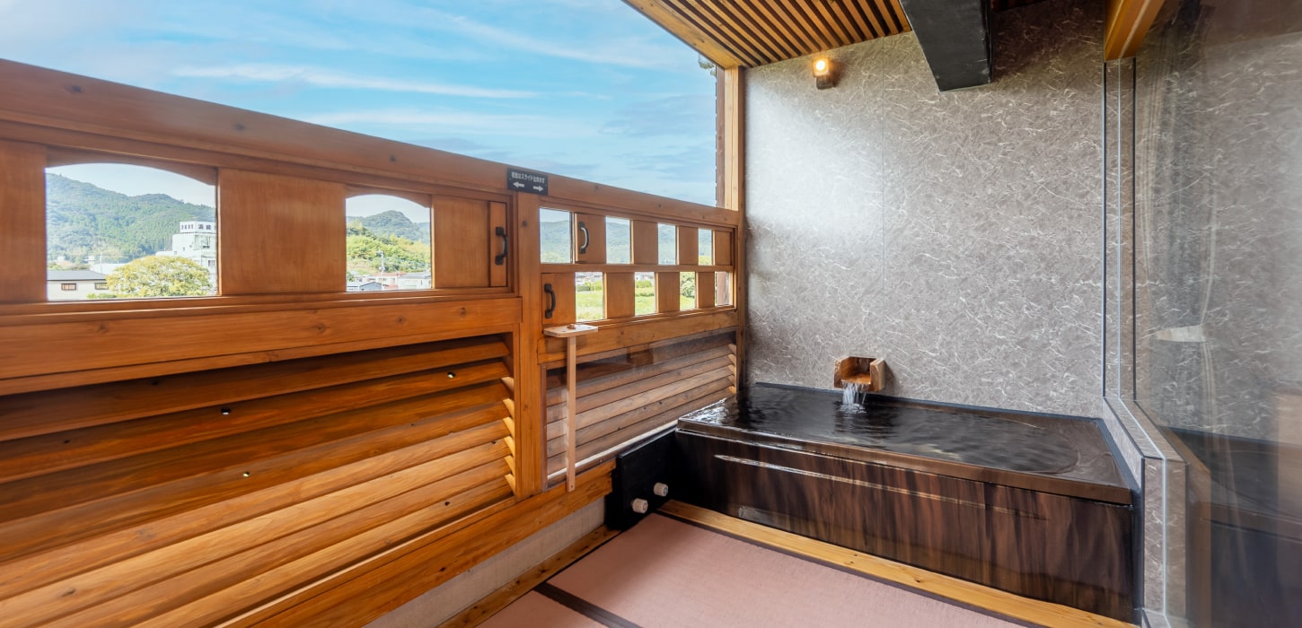 テラスに備えた源泉かけ流しの露天風呂はブロアバス付。室内、テラスはともに禁煙でございます。