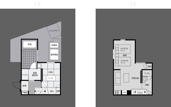 1階(和室)と2階(ベッドルーム)の2部屋で専用露天風呂と内風呂の2つの湯船が楽しめます。
