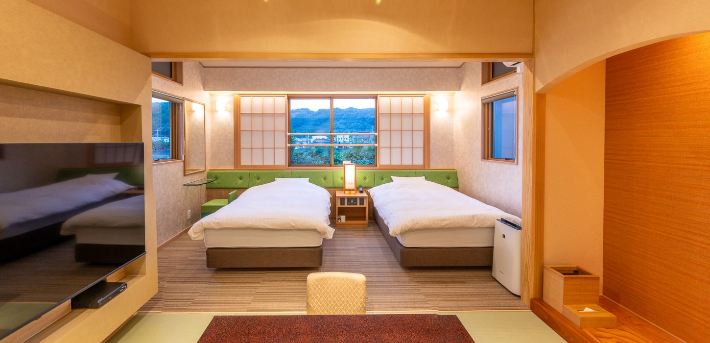 2階にシングルサイズのベッド2台を備えた、寛ぎを満喫できる畳敷きの客室。